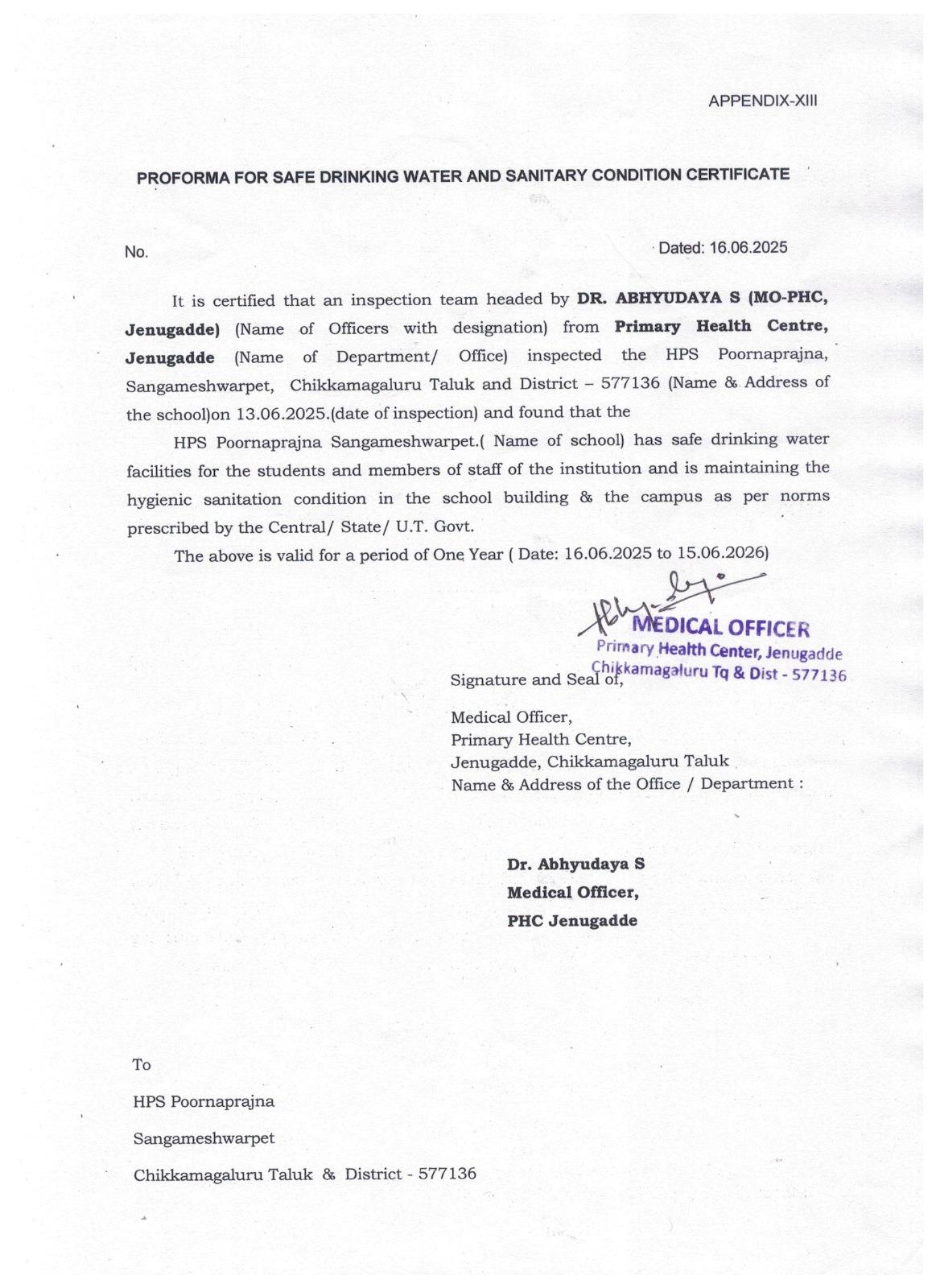 - Proforma for safe drinking water and sanitary condition certificate