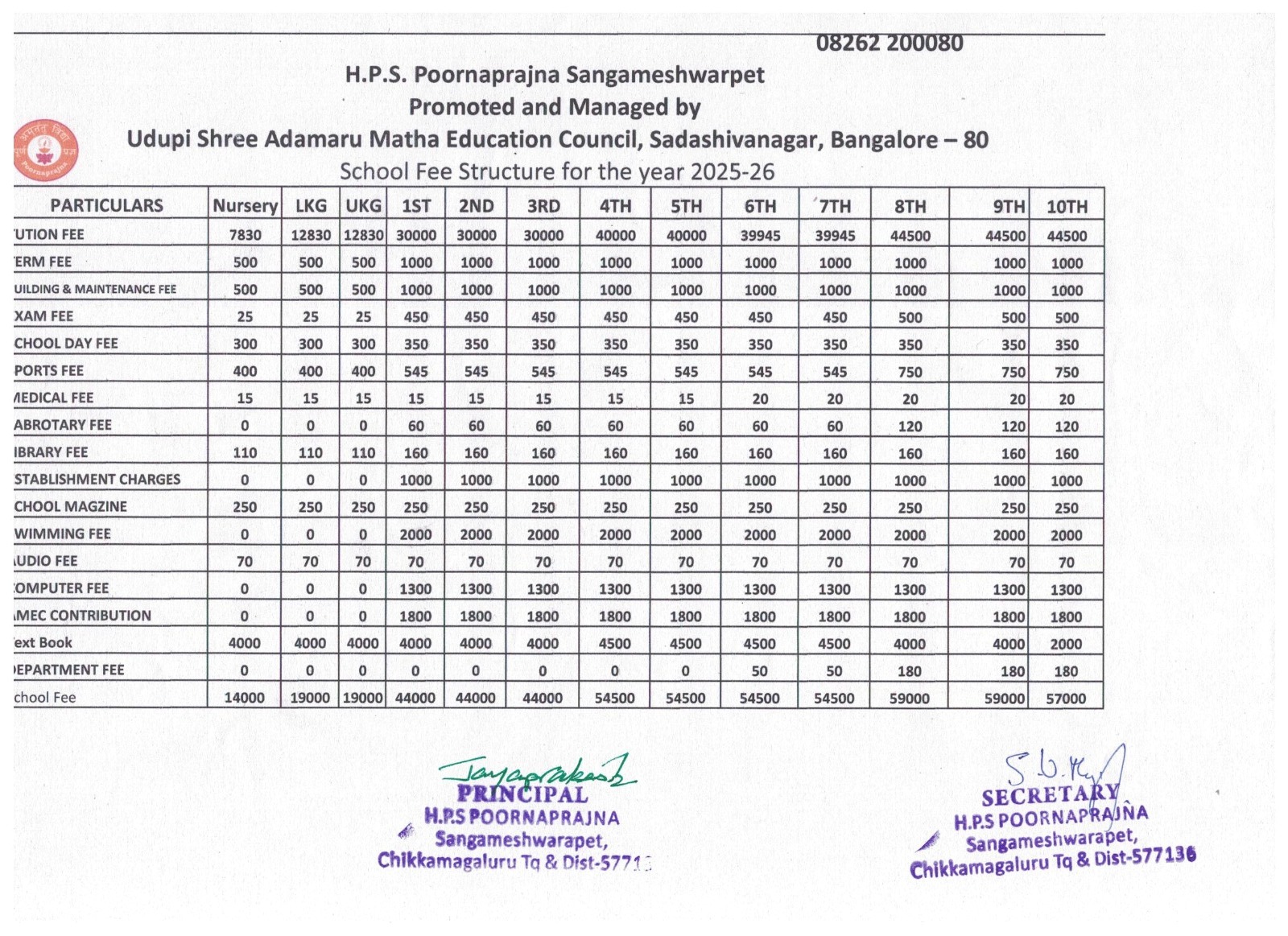- School Fee structure for the year 2025-26